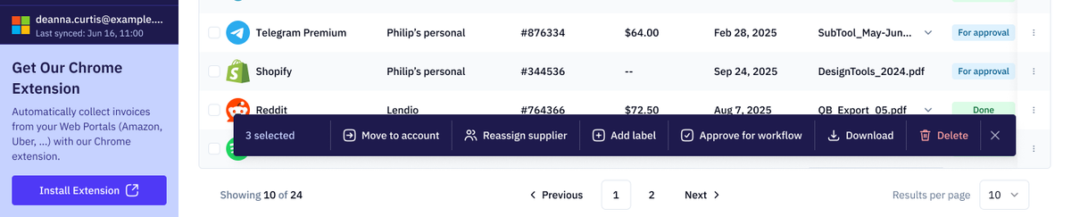 Each PDF invoice will be read (in case an invoice is accompanied by a UBL XML, that data takes precedence). The extracted data is used to orchestrate the invoices.