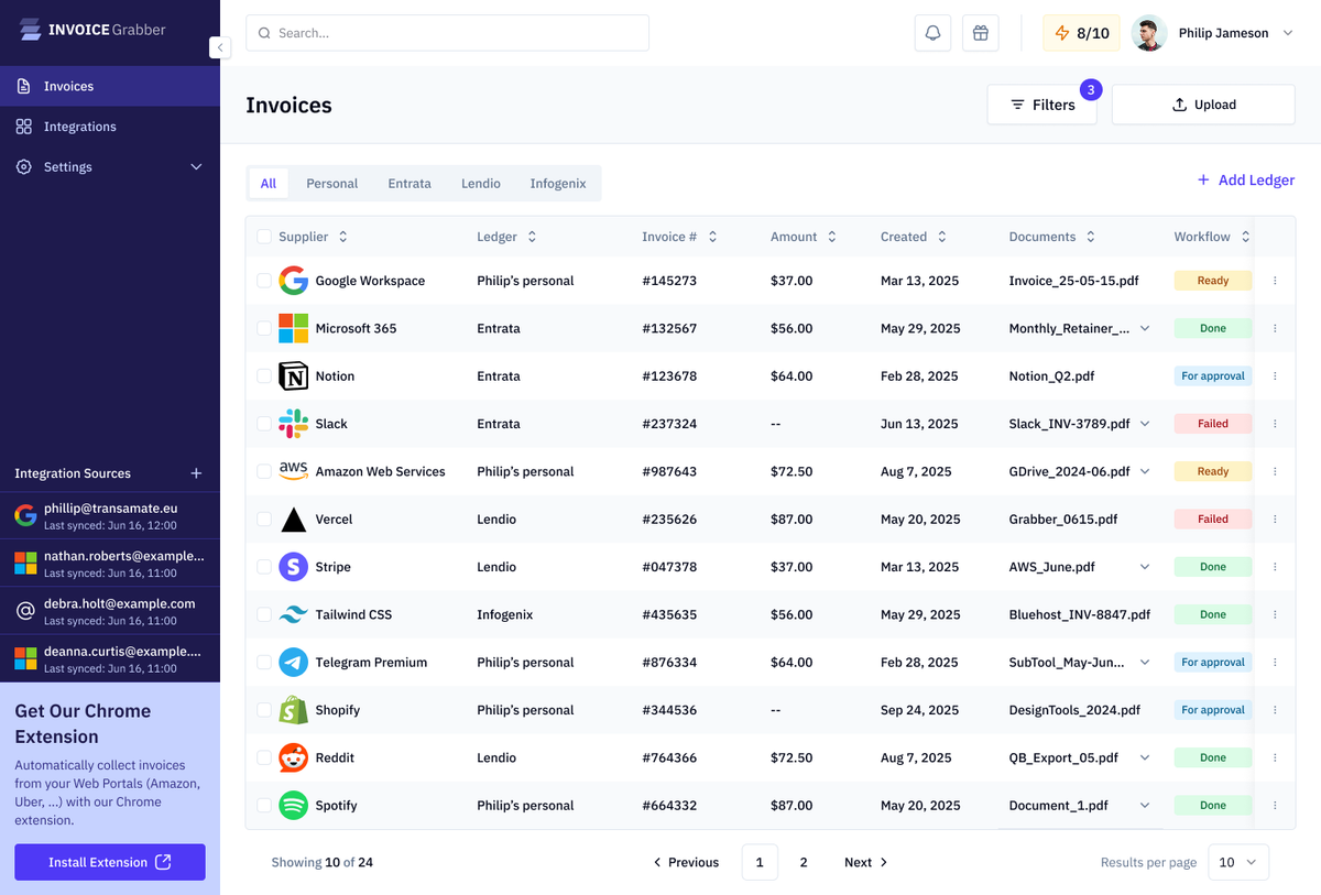 Either invoices are assigned manually to the ledger, or the automated parsing will try to match the invoices to the ledgers, given the meta information such as tax id, IBAN numbers, etc.