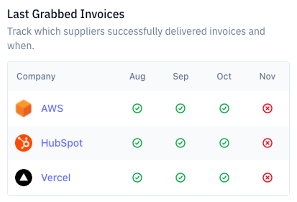 The overview will show the last 4 months and indicate if the invoice has been retrieved. The last scrape date is visible when you hover over them or in the list below.