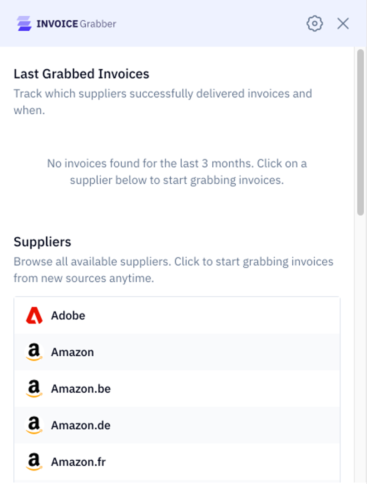Invoice grabber's chrome extension is you buddy that you can take to all different platforms that are not sending you invoices. It will fetch invoices from various providers (see list below) and send them to the grabber platform.